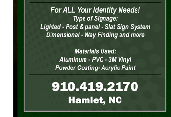 At TRG Sign Company in Hamlet NC, we understand that good signage can attract new customers. We go above & beyond helping you reach your advertising goals bringing you a wide variety of products and services. We offer high quality sign layout, vinyl lettering, vehicle lettering, graphics, magnetic, banners and much more. Whatever your sign needs may be, at TRG Sign Company, we guarantee an enjoyable and fulfilling experience.